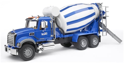 The incredibly realistic driver's cabin with its doors that can be opened, the tilting engine bonnet, providing a view of the engine block, the foldable rear-view mirrors, and the many add-on accessories, which give the its chrome look, make this truck a true feast for the eyes of every truck fan. The cement mixer barrel (barrel with mixing spiral) can be turned by a fold-out crank handle that is lowered into the water tank (dummy). Depending on its direction of rotation, the goods will be loaded into or transported out of the barrel. The chutes attached to the sides of the assembly can be slipped over the rear concrete chute. To expand the play options, you can attach a rake blade (Item No. 02573), a sweeping machine (Item No. 02577) or a cable winch (assortment Item No. 02008) (not included) to the receiver on the MACK Granite's fender.