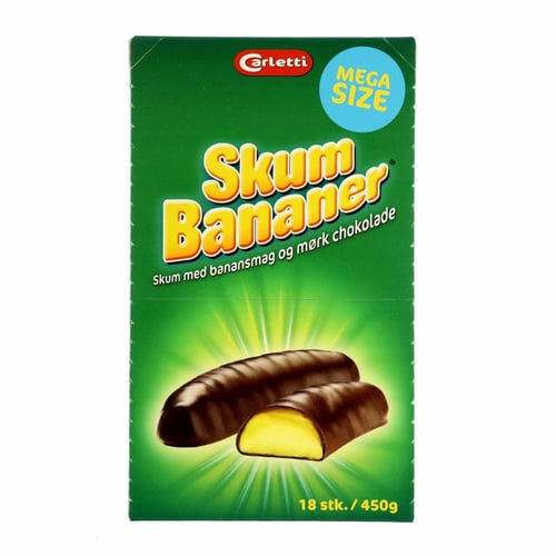 Ingredients: Glukosesirup, sukker, vand, kakaomasse, gelatine, stabilisator (sorbitolsirup), skumdannende middel (MÆLKEPROTEIN), emulgator (solsikkelecithin, aroma (bananaroma), farvestoffer (beta-caroten, riboflavin).