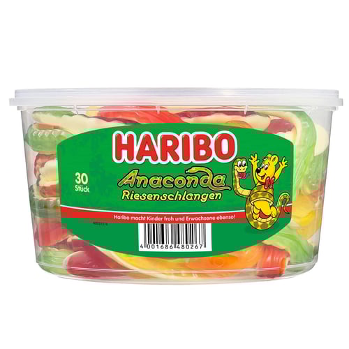Make your candy experience more fun with Haribo Anaconda! These colorful, tasty candy tubes are a favorite with kids and adults alike. Each bag contains 30 pieces, perfect for a party or just a fun night at home. Made with ingredients such as glucose syrup, sugar, dextrose and gelatin, these sweets are sure to satisfy your sweet tooth. Allergy information: May contain traces of milk, wheat. Weight 1kg.