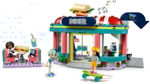 Kids aged 6 and up can play out lots of restaurant-themed stories with this LEGO® Friends Heartlake Diner (41728) building toy. There are plenty of accessories to inspire creative play, so kids can pretend they're making a sandwich or being a customer in the diner. Details include a drive-in window, outdoor seating, as well as an arcade game and jukebox. Kids can use the salad ingredients in the fridge to create their own sandwiches. Other accessories include 2 drinks, money, 3 slices of bread for sandwiches, a napkin holder, a trash can and a skateboard. There's also a cheeky cat who loves to visit the diner! Make the building process even more fun Have an easy and intuitive building adventure with the LEGO Builder app. Kids can zoom in and rotate 3D models, save sets and keep track of their progress. Welcome to Heartlake's next generation Kids can make friends and discover exciting places in the LEGO Friends universe where they can enjoy creative play and real-life adventures. Restaurant-themed role play for kids aged 6 and up - Inspire hours of creative role play with this LEGO® Friends Heartlake diner (41728) set Includes 3 mini-dolls - This Heartlake set features LEGO® Friends characters Liann, Aliya and Charli, plus lots of restaurant-inspired accessories Inspires imaginative role play - kids can pretend to make sandwiches with the bread and ingredients in the fridge, or imagine they are customers in the diner A fun place to relax - Kids who love restaurant-themed play will enjoy details like the drive-in window, outdoor seating, as well as an arcade game and a moving jukebox Play sets that can be used again and again - This LEGO® Friends gift makes a fun birthday present, holiday gift or surprise for any occasion for kids aged 6 and up who love imaginative play Made for play - The diner is over 11 cm high, 19 cm wide and 11 cm deep A helping hand - Find intuitive building guidance in the LEGO® Builder app, where kids can zoom in and rotate 3D models, keep track of their progress and save sets while developing new skills Heartlake's new generation - In January 2023, the LEGO® Friends universe has been expanded with new characters and new places to inspire kids to play more adventurous role-play Uncompromising quality - All LEGO® components meet stringent industry standards to ensure they are consistent, connect perfectly and are easy to build with A safe choice - LEGO® Friends bricks and pieces are dropped, heated, crushed, crushed, twisted and analyzed to make sure they meet stringent global safety standards