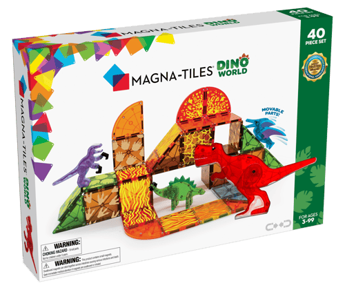 Volcanic explosions, molten lava and hours of imaginative play are bursting from the Dino World 40-Piece set! Four, oversized, fully-magnetic dinosaurs navigate a rocky volcanic terrain that puts the steam in STEAM learning. Turn up the heat on screen-free fun and imaginative play possibilities with this fun and ferocious new addition to the MAGNA-TILES® collection.