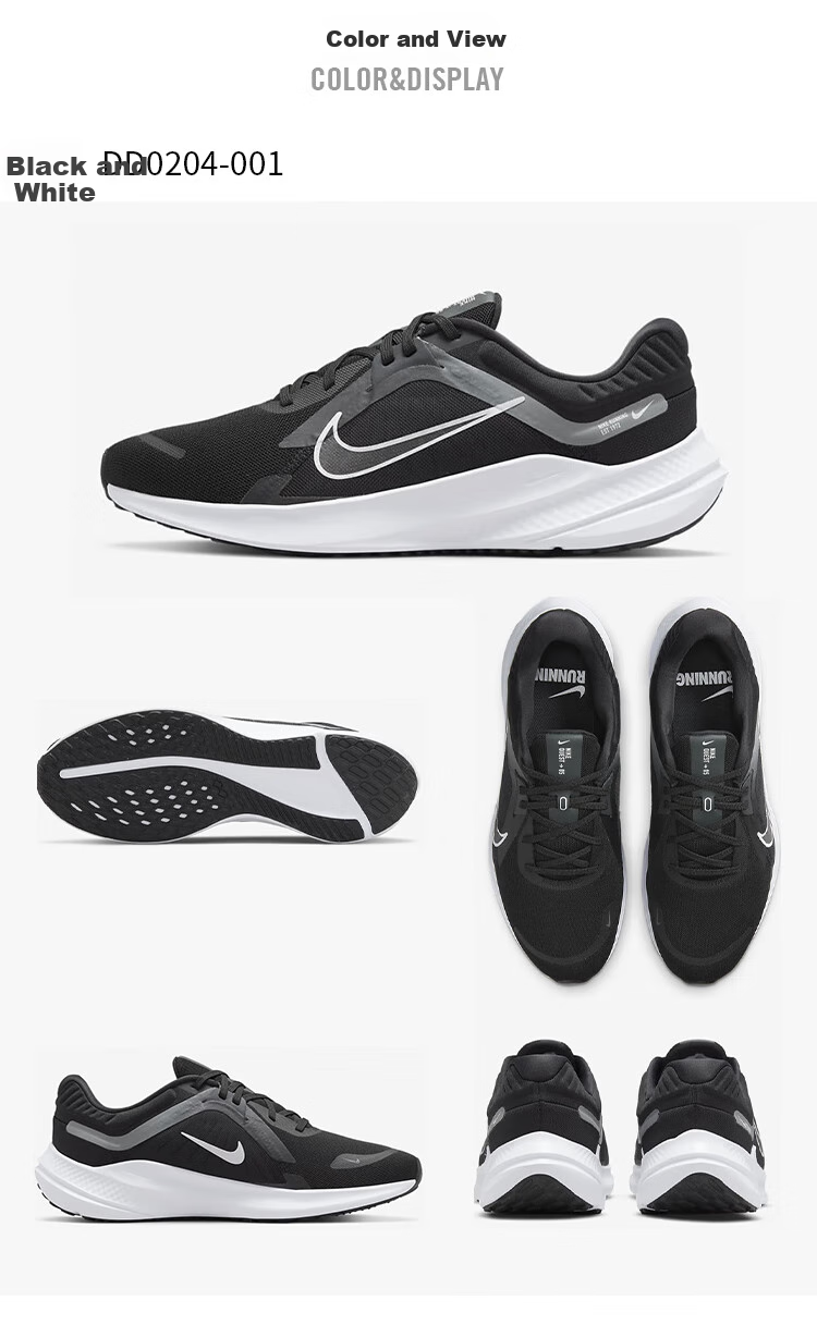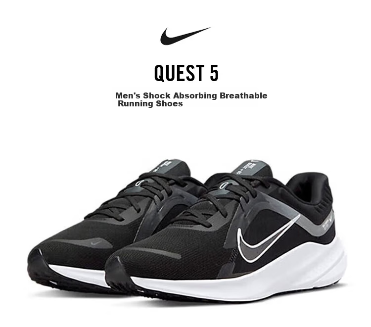 **Description:** Lace up and challenge yourself to achieve new personal goals with NikeQuest5 men's running shoes. Crafted with meticulous design to help you make your wishes come true. The shoe features a mesh upper for lightweight breathability. Key areas incorporate mesh design based on runner feedback to create a cool sensation in critical areas. These running shoes offer outstanding traction, providing a smooth and comfortable cushioned walking experience. Equipped with high-quality foam to enhance cushioning and achieve excellent transition from heel to toe.