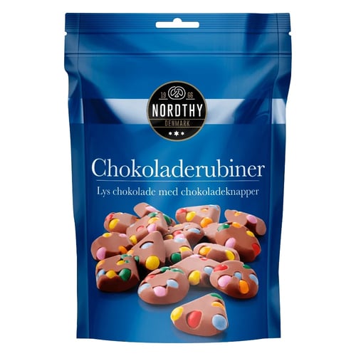 Ingredients: Sukker*, kakaosmør, SØDMÆLKSPULVER, kakaomasse, vallepulver (MÆLK), emulgatorer (SOJALECITHINER, solsikkelecithiner, E476), risstivelse, fortykningsmiddel (E414), salt, overfladebehandlingsmidler (E901, E903, E904), farvestoffer (E100, E141, E160a, E162), naturlig vaniljearoma. Kan indeholde spor af jordnødder, hasselnødder og mandler. Opbevaring: Produktet skal opbevares tørt, ikke for varmt og beskyttet mod direkte sollys.