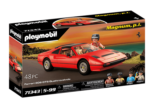 The red Ferrari 308 GTS Quattrovalvole is one of the trademarks of the 80s crime series Magnum, p.i.. How private detective Thomas Magnum darts across Hawaii in his red super sports car and solves exciting criminal cases, is TV history and to this day inspires fans around the world. Now the cult vehicle including Thomas Magnum, T.C., Rick and Higgins appears in PLAYMOBIL format with lots of great details. In addition to hinged headlights in the front and an opening hood in the rear, the Ferrari has a removable roof. Not only series fans and car collectors will be thrilled by this detailed vehicle model. I know what you're thinking, and you're right!, you simply have to have this PLAYMOBIL Ferrari!
