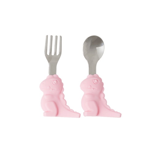 Kids cutlery consisting of a spoon and a fork in light pink. The cutlery is shaped like a dinosaur. The child-friendly cutlery has no sharp edges... easy to handle for little fingers when the difficult art - being able to do it yourself - has to be learned. Colorful functionality at child height!