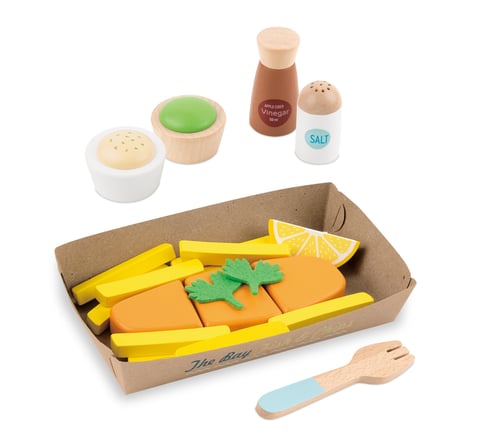 Smallwood - Fish and Chips. From 3 years and up. This entertaining playset is a perfect addition to your child's imaginative kitchen adventures. The set includes a paper tray reminiscent of those found in a traditional fish and chips shop, along with an assortment of wooden and felt accessories. This allows your child to prepare and serve the British classic, fish and chips, like a real chef. Designed for children aged 3 and up, this playset encourages creative play and fine motor skill development. It's a fantastic way for children to engage in role-play and enjoy hours of fun preparing imaginative meals. Let your child explore culinary adventures with the Smallwood Fish and Chips set!