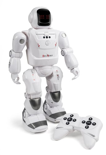 Mega robot with infrared control. Large 40 cm robot with many exciting functions. Specifications Infrared controlled With motion sensor Programming of up to 48 functions With face lights with different expressions Robot sounds Walks and slides off in all directions Moves the arms Automatically switches off when not in use Incl. detailed instructions Uses 4 pcs. AA batteries and 2 pcs. AAA batteries.