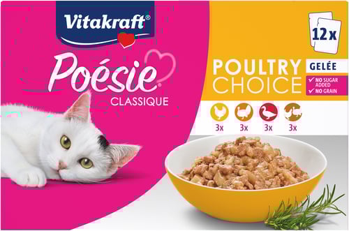Poesie® Classique: favorite food in reserve size! The fine wet food selection Poultry Choice in delicious jelly is made without the addition of grain, sugar and artificial colors and preservatives .