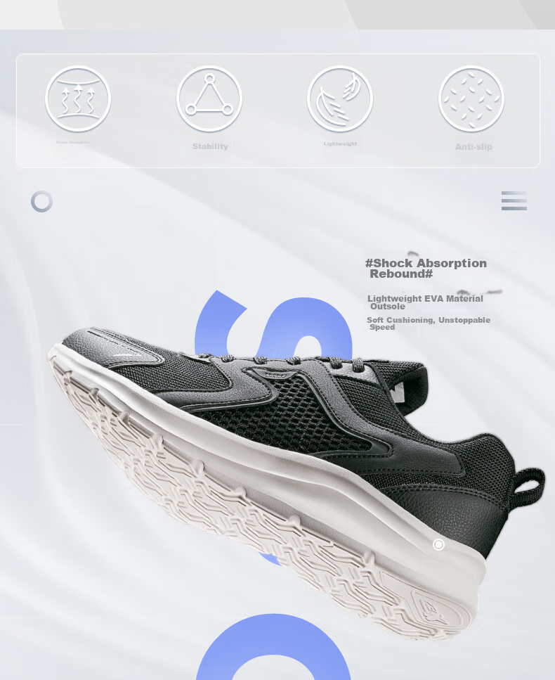 - Features include shock absorption, stability, lightweight design, and anti-slip properties.